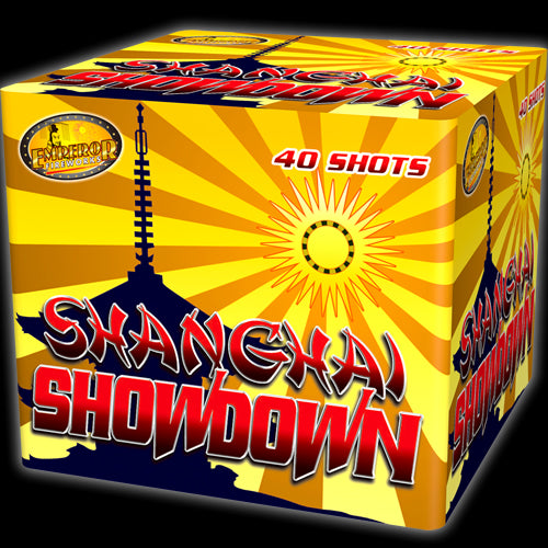 40 Shot 1.3g - Shanghai Showdown Contains a Mixture of Straight and Fan Shaped Shots. Red Comets to Red Pearls & Crackling Coconuts, ‘C’ Shape Fan of Blue Comets Bursting into Green Coconut with Crackling Chrysanthemum, Red Comets into Purple Coconut Chrysanthemum, ‘C’ Shape Fan of Red Comets into Silver Peonies with Red Stars and a Finale of Silver Spinners Exploding into Silver Chrysanthemums.